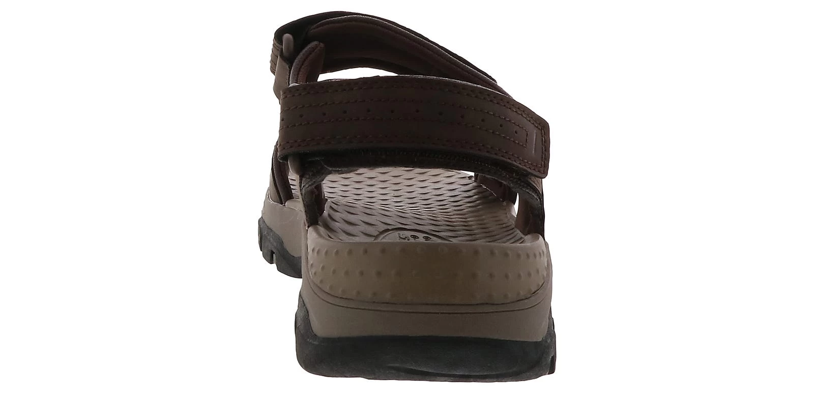 Stay comfortable with long lasting comfort with the Skechers Tresman Garo Men’s Sandal/ This relaxed-fit sandal provides a roomy comfort fit from the toe to forefoot, while the durable smooth synthetic upper features an open-toe and hook-and-loop closure. The steady grip durable outsole is supportive and shock-absorbing. The Luxe Foam cushioned comfort insole adds cushioning to every step. Travel all day with the Skechers Tresman Garo Men’s Sandal.