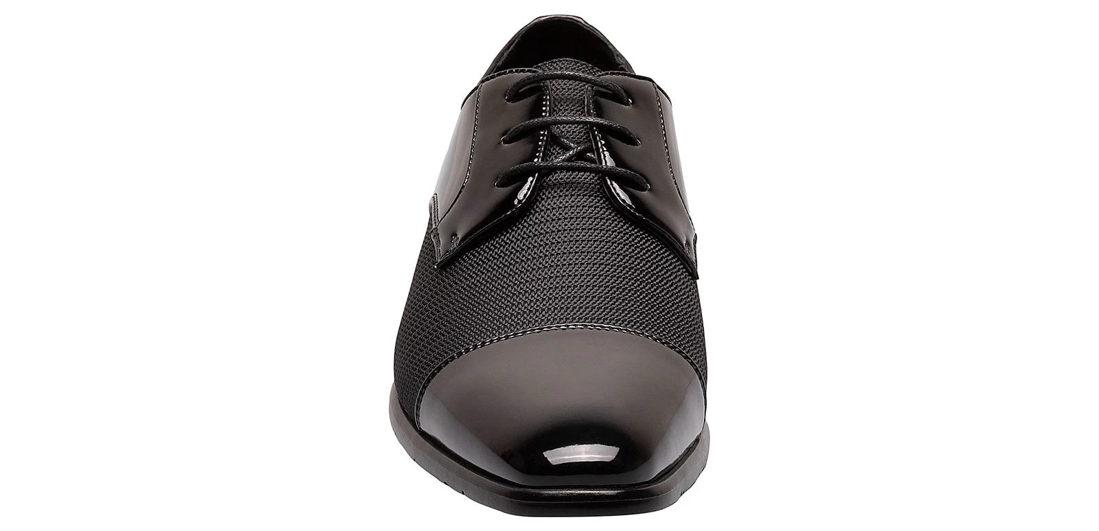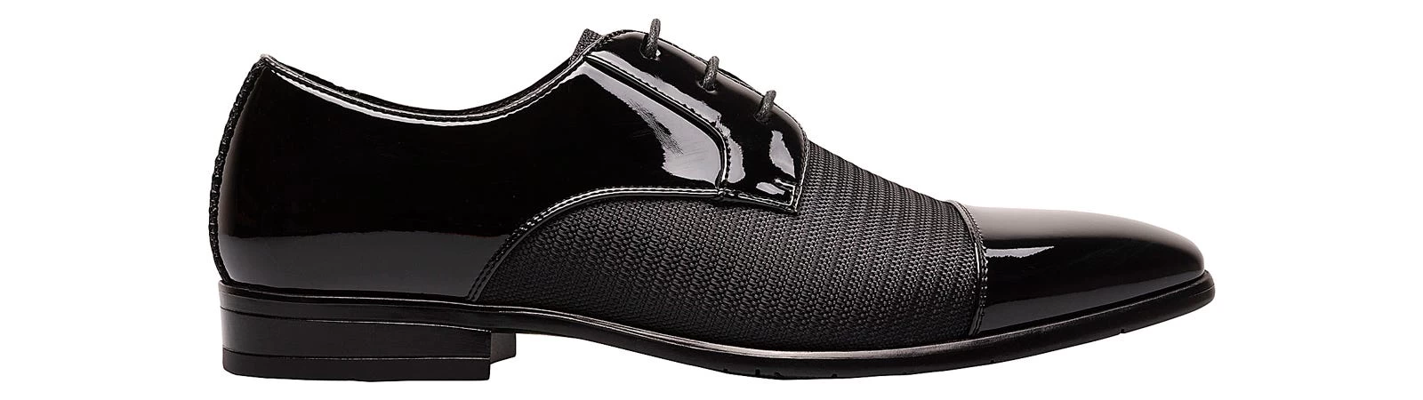- Patent leather and knit textile upper
